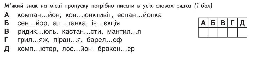 6. М'який знак на місці пропуску потрібно писати в усіх словах рядка (1 бал) A компан...йон, кон…..юнктивіт, еспан...йолка сен...йор, ал...танка, ін...єкція ридик...юль, кастан...ети, мантил...я грил…яж, піран...я, барел...Єф Д комп...ютер, лос...йон, бракон...єр BBLA А Б В Г