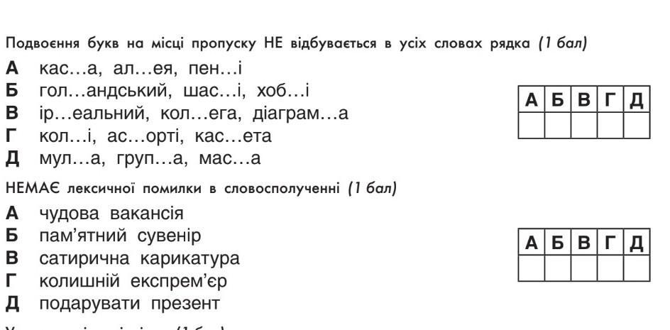 6. НЕМАЄ лексичноï помилки в словосполученні (1 бал) А чудова вакансія Б пам'ятний сувенір В сатирична карикатура Г колишній експрем'єр Д подарувати презент А|Б|В|Г|Д А Б В Г Д