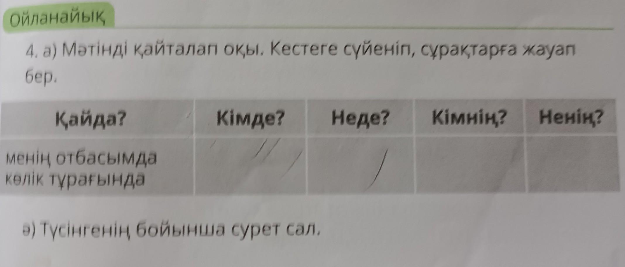 Ойланайык 4. а) Мәтінді қайталап оқы. Кестеге сүйеніп, сұрақтарға жауап бер. Қайда? менің отбасымда көлік тұрағында ә) Түсінгенің бойынша сурет сал. Кімде? Неде? Кiмнiң? Ненің?