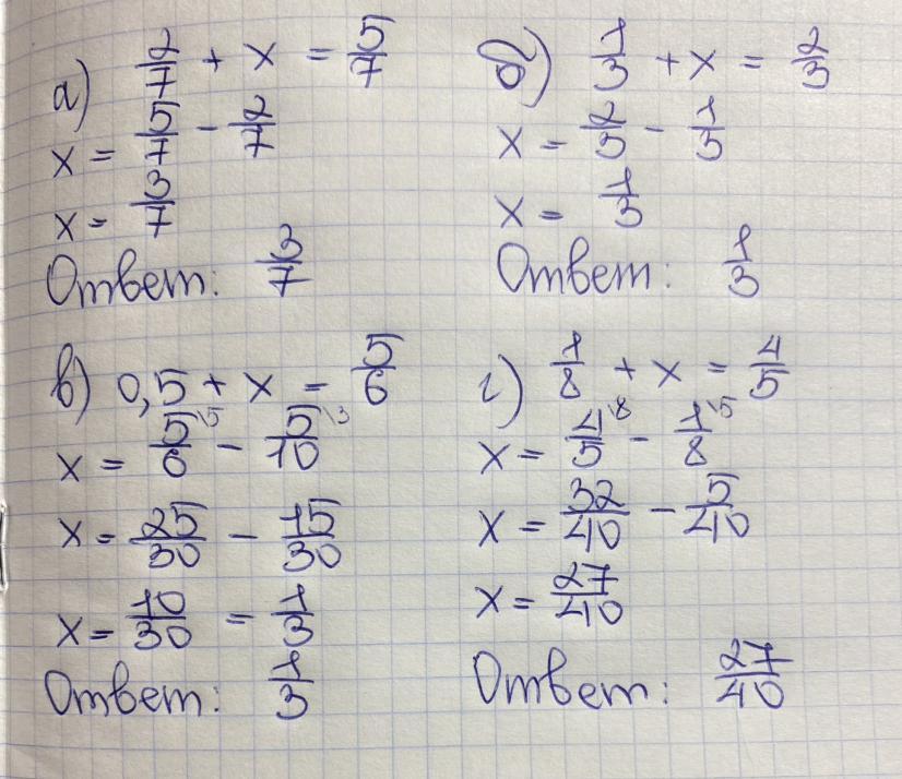 а) 2/7 + х = 5/7; б) 1/3 + х = 2/3;