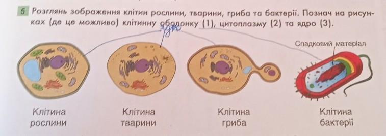 розглянь зображення клітин рослин тварин гриба та бактерії. познач на рисунках (де це можливо) клітинну оболонку (1), цитоплазму (2), та ядро (3).