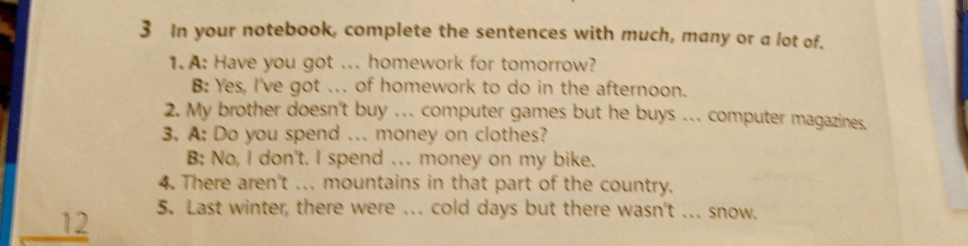 12 3 In your notebook, complete the sentences with much, many or a lot of. 1. A: Have you got ... homework for tomorrow? B: Yes, I've got ... of homework to do in the afternoon. 2. My brother doesn't buy ... computer games but he buys ... computer magazines. 3. A: Do you spend ... money on clothes? B: No, I don't. I spend ... money on my bike. 4. There aren't... mountains in that part of the country. 5. Last winter, there were ... cold days but there wasn't ... snow.