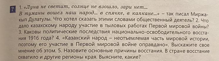 Ответ:2: Казахский народ участвовал в1 мирой войне потому что мы были в составе Росийской империи , а также Российской империи не хватало армии и так де наших солдат было не мало. 3. Восстание 1916 года мы проиграли , а так жев виде последствий было много погибших , пострадавших из-за того что люди скапливались в одном месте и устраивали бунты и митинги.