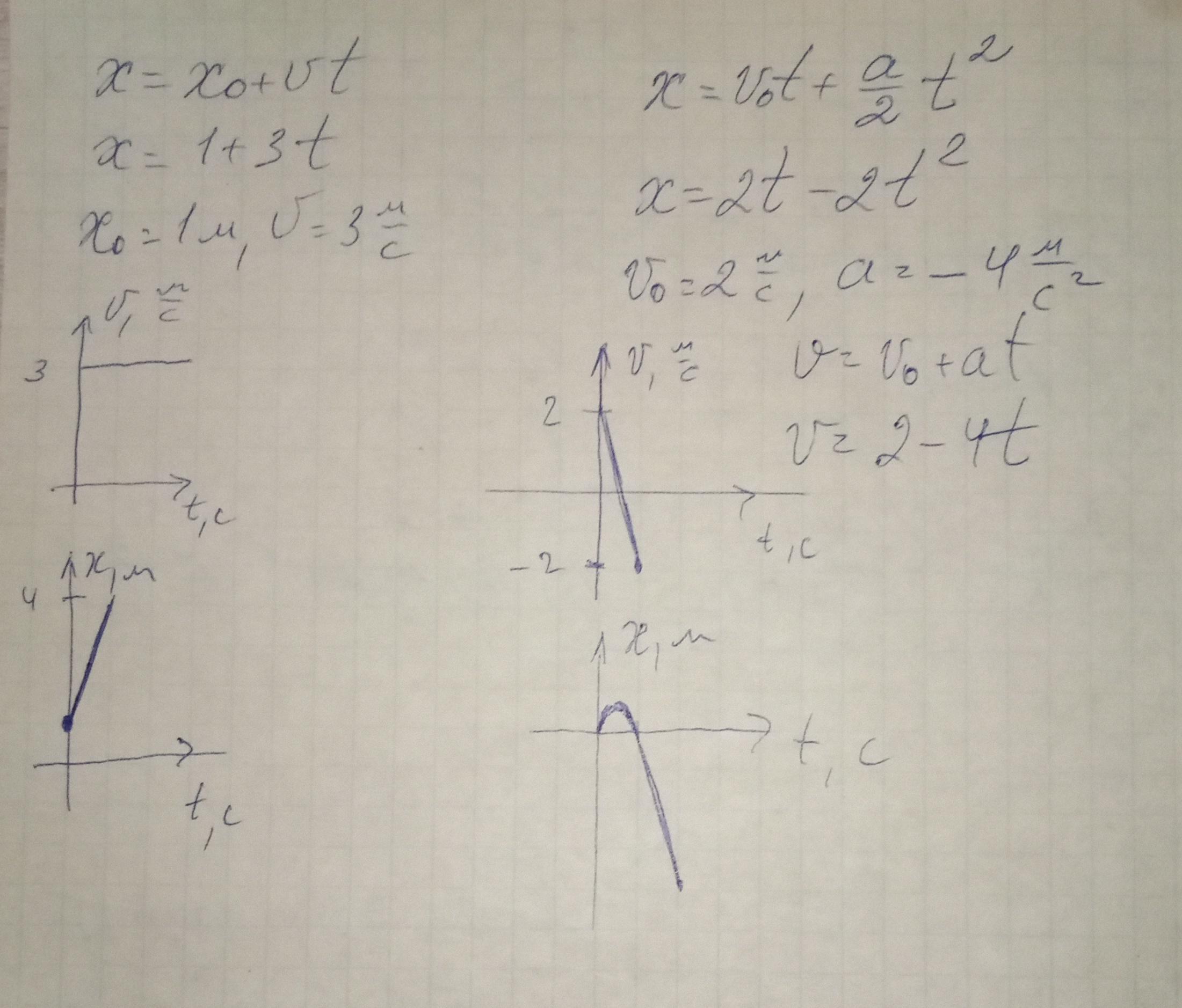 прямолинейные равнопеременные движения тел описываются формулами X=1+3t;x=2t-2t².Опишите эти движения.Постройте для каждого из них графики Ux(t);x(t).