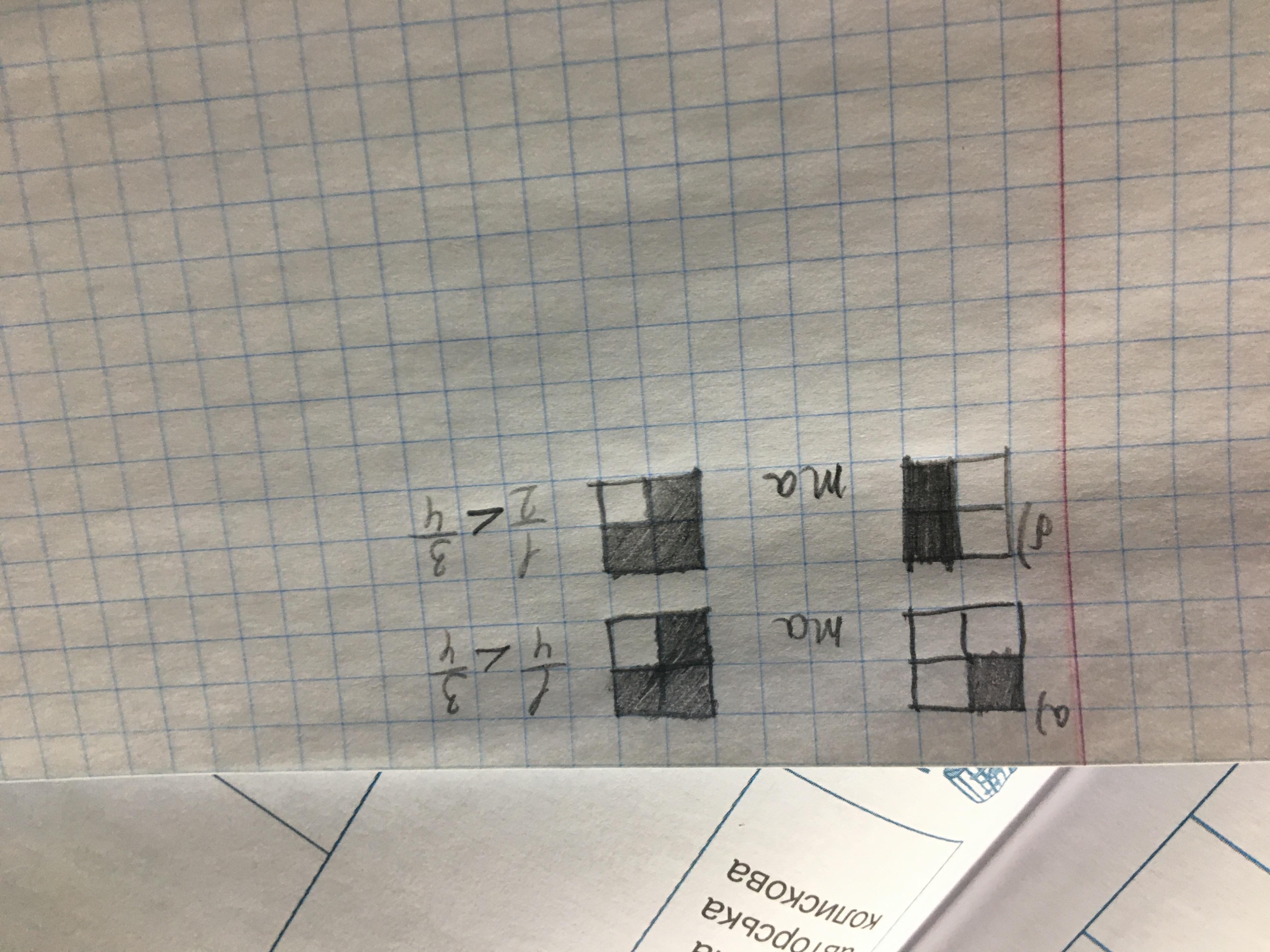 Накресліть два квадрати зі стороною 4 клітинки. На кож- ному з них зафарбуйте частину, що відповідає подано- му дробу. Порівняйте дроби