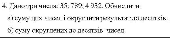 Дано три числа: 35; 789; 4 932. Обчислити: а) суму цих чисел і округлити результат до десятк i б) суму округлених до десятків чисел.