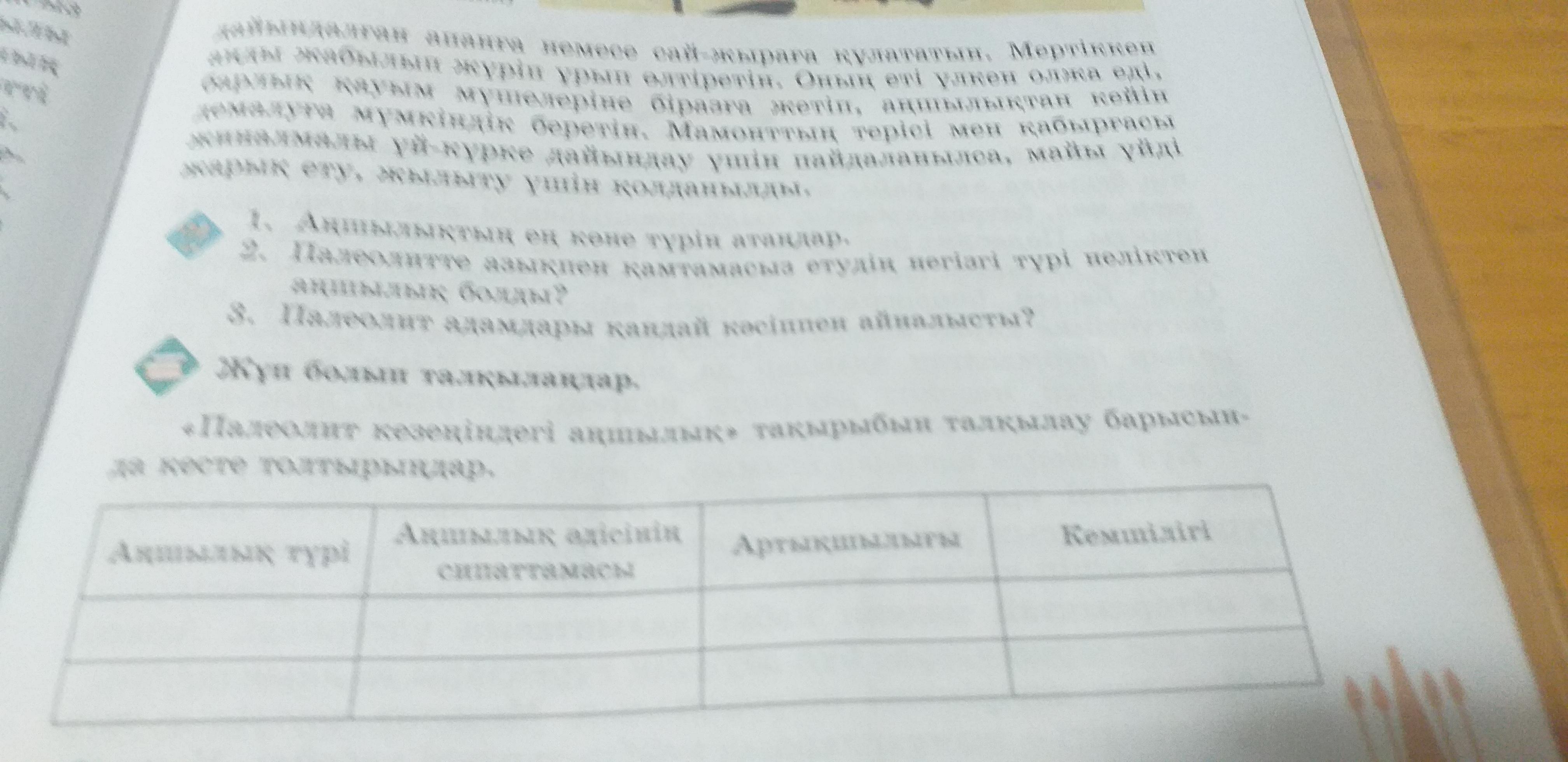 Палеолит кезеңіндегі аңшылық тақырыбын талқылау барысында кесте толтырыңдар.
