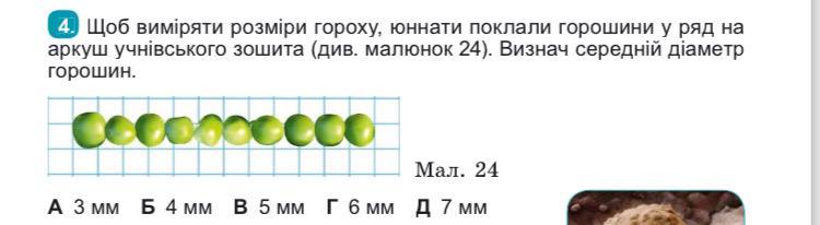 Щоб виміряти розміри гороху, юннати поклали горошини у ряд на аркуш учнівського зошита (див. малюнок 24). Визнач середній діаметр горошин.
