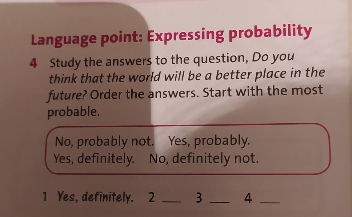 Language point: Expressing probability 4 Study the answers to the question, Do you think that the world will be a better place in the future? Order the answers. Start with the most probable. No, probably not. Yes, probably. Yes, definitely. No, definitely not. 1 Yes, definitely. 2 3 4 -▬▬▬▬▬▬▬▬▬▬