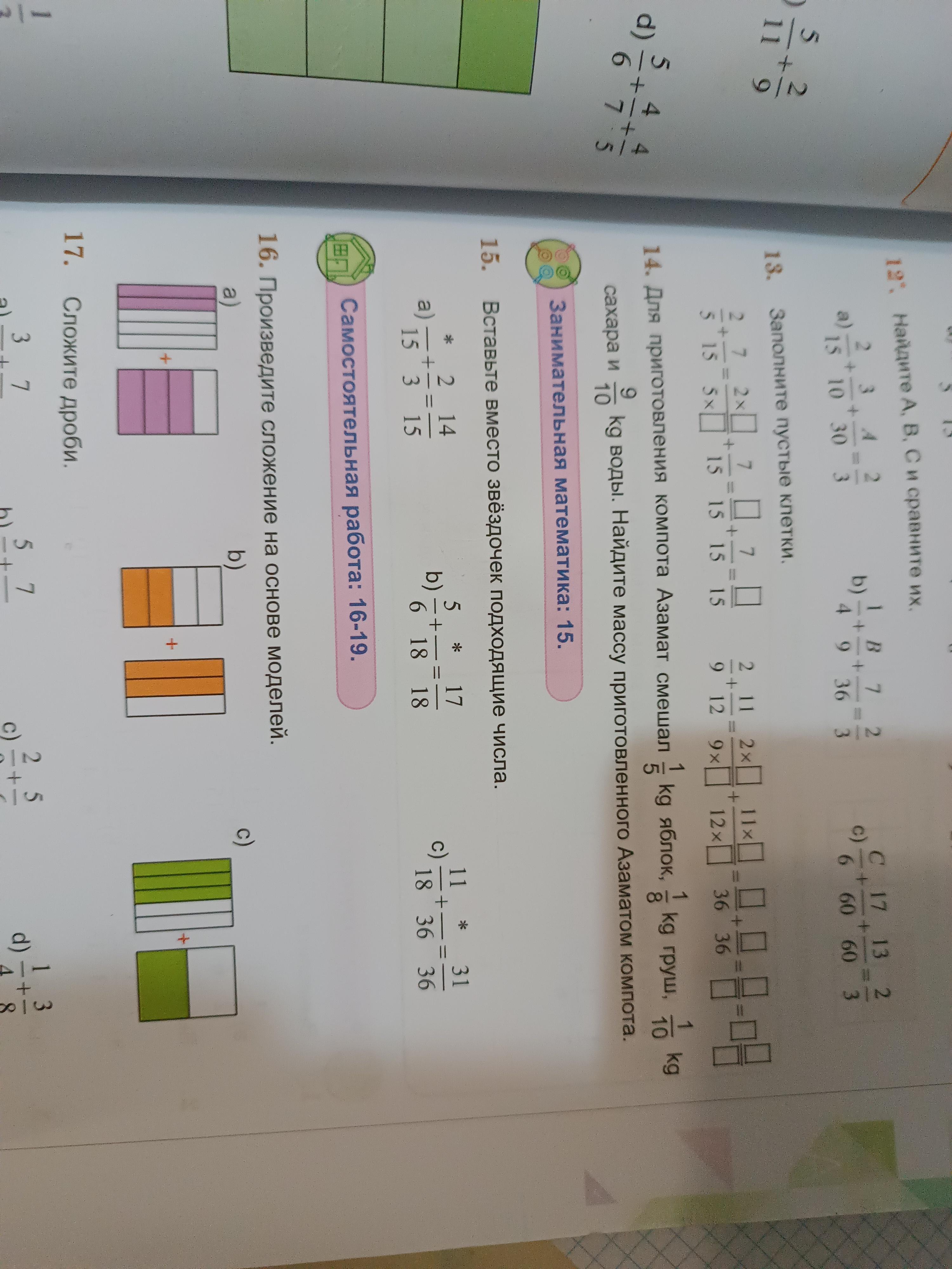 а ) 4/15 + 2/3 = 14/15 ; b ) 5/6 + 2/18 = 17/18 ; c ) 11/18 + 9/36 = 31/36 .