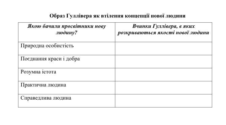 У першій частині роману Свіфта “Мандри Лемюеля Гуллівера” Гуллівер показує себе як природну особистість, яка не залежить від соціальних умов і норм. Він не прагне до слави, багатства або влади, а лише до знань і досвіду.