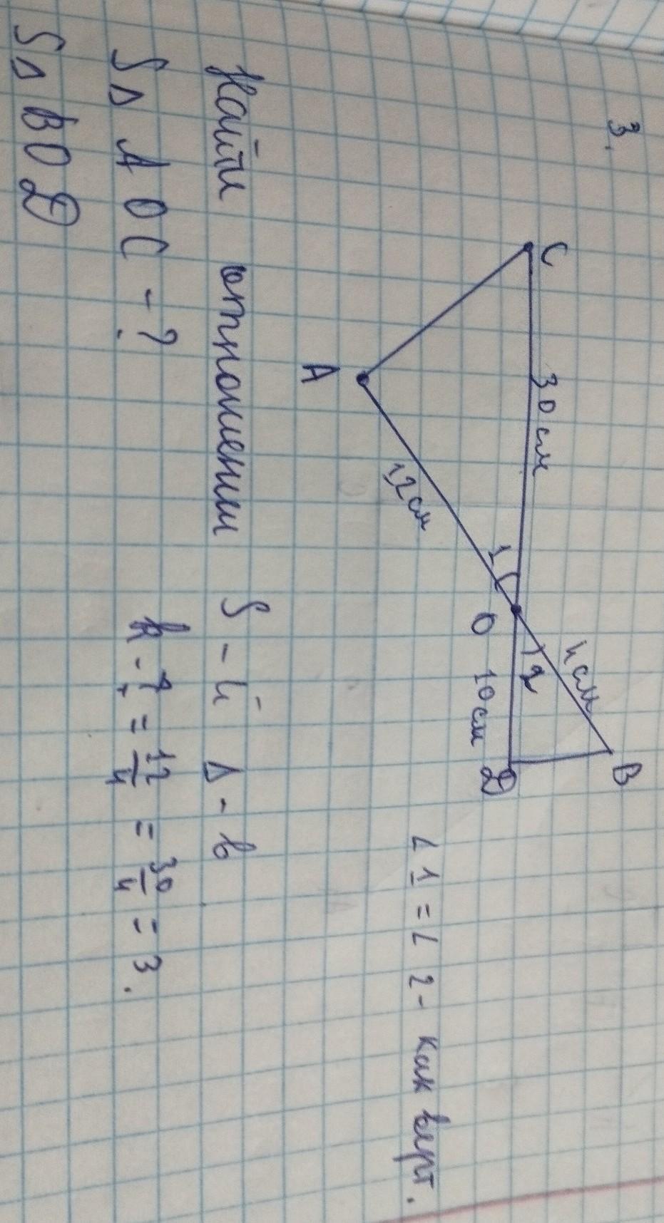 Чтобы найти отношение S∆AOC к S∆BOD, зная коэффициент подобия k = 3, вы можете использовать следующее правило: отношение площадей двух подобных фигур равно квадрату коэффициента подобия.