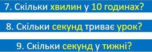 7. Скільки хвилин у 10 годинах? 8. Скільки секунд триває урок? 9. Скільки секунд у тижнi?