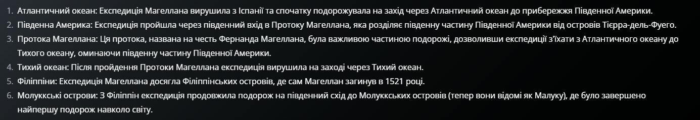 Пояснення:Фернан Магеллан був португальським мореплавцем, який в 1519-1522 роках провів перший відомий нам спробу обійти світ навколо. Цей подвиг був однією з найважливіших подій в історії географії та дослідження світу. Ось деякі географічні об'єкти та місця, через які проходив шлях Магеллана: