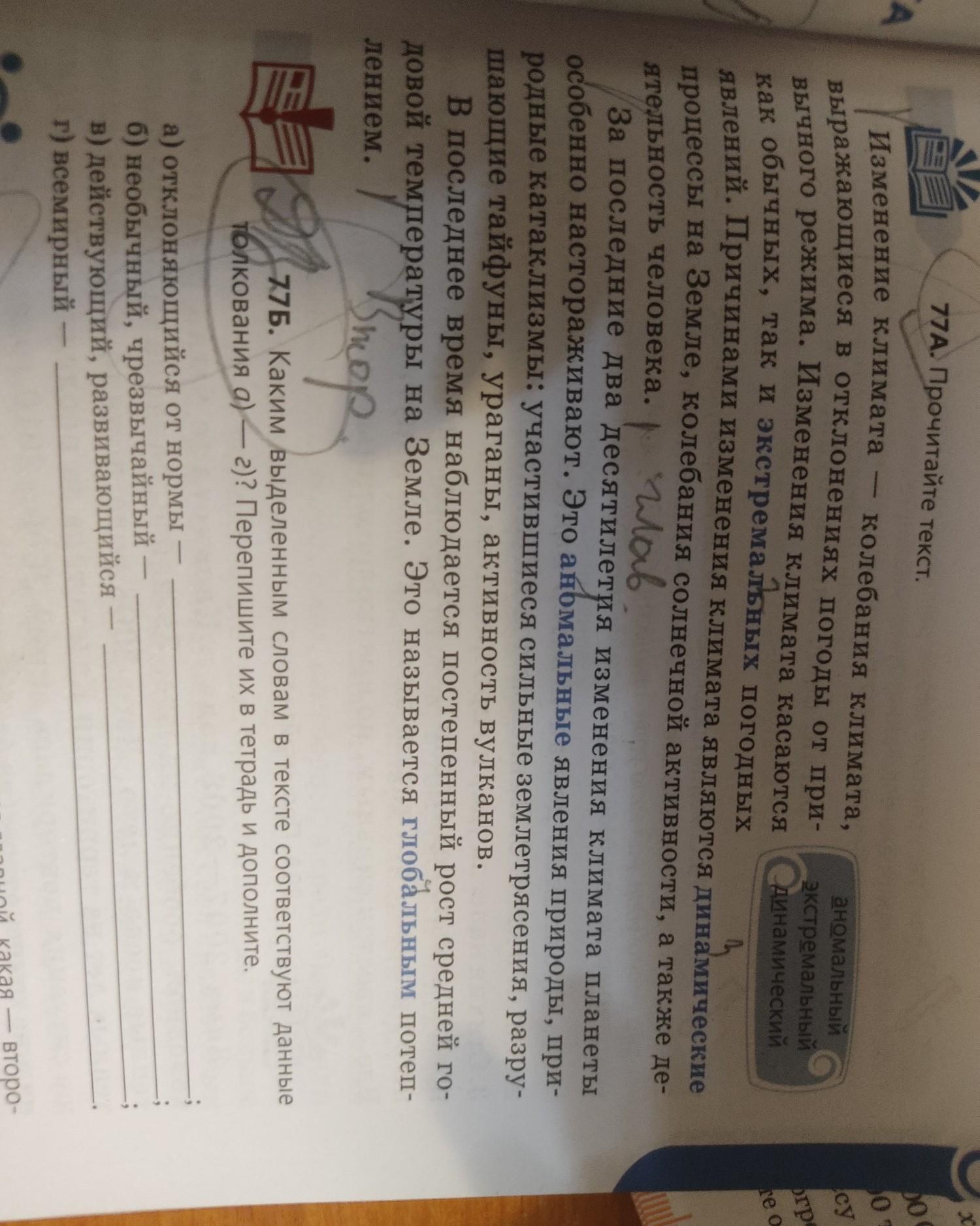 77Б. Каким выделенным словам в тексте соответствуют данные толкования а)-г)? Перепишите из в тетрадь и дополните.