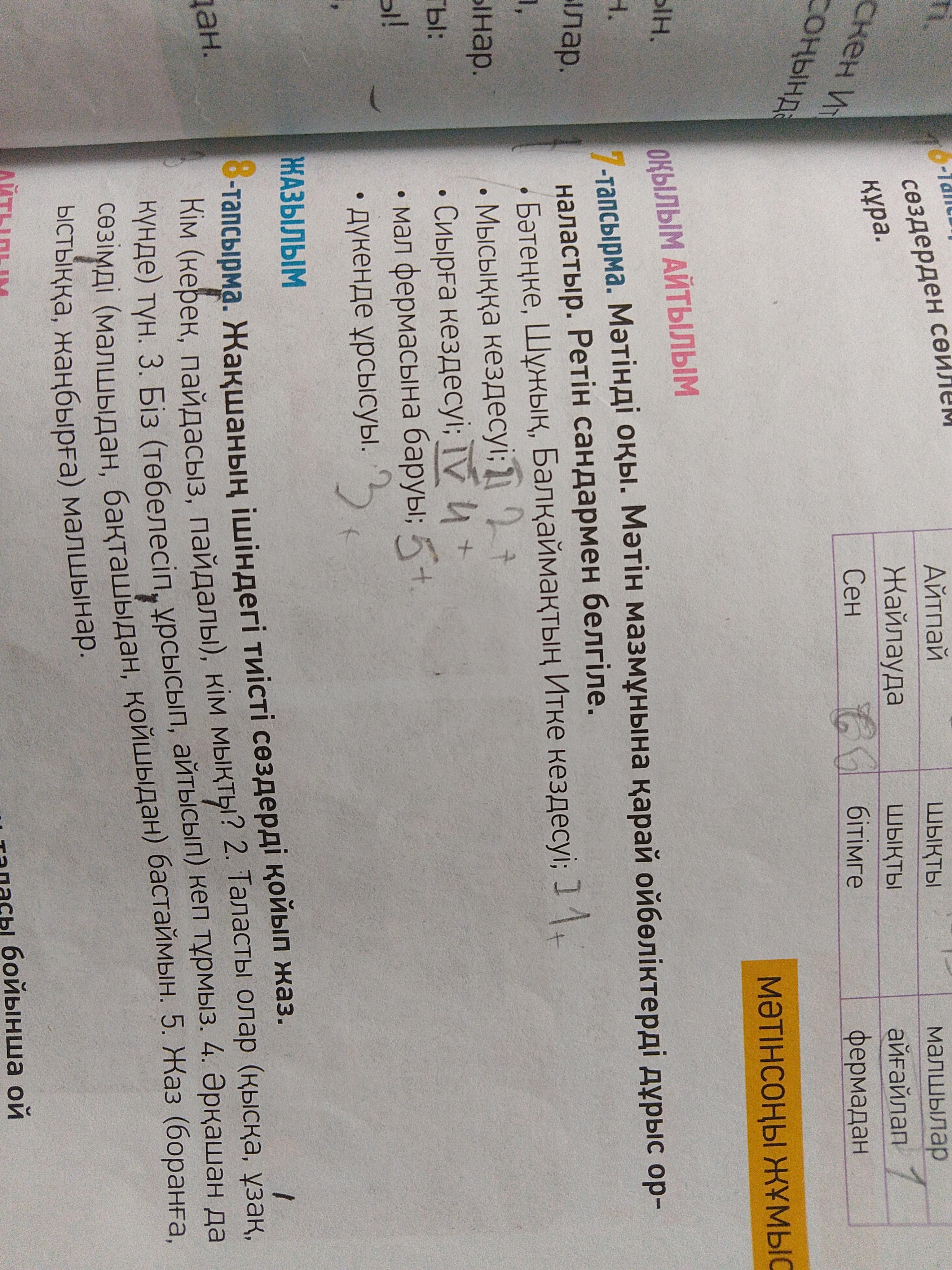 -тапсырма. Мәтінді оқы. Мәтін мазмұнына қарай ойбөліктерді дұрыс ор- наластыр. Ретiн сандармен белгіле. • Батенке, Шужык, Балқаймақтың Итке кездесуі; • Мысыкка кездесуі; Сиырға кездесуі; • мал фермасына баруы; .