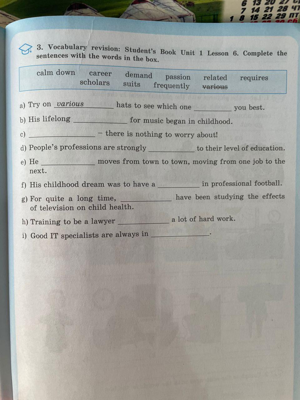 3. Vocabulary revision: Student's Book Unit 1 Lesson 6. Complete the sentences with the words in the box.