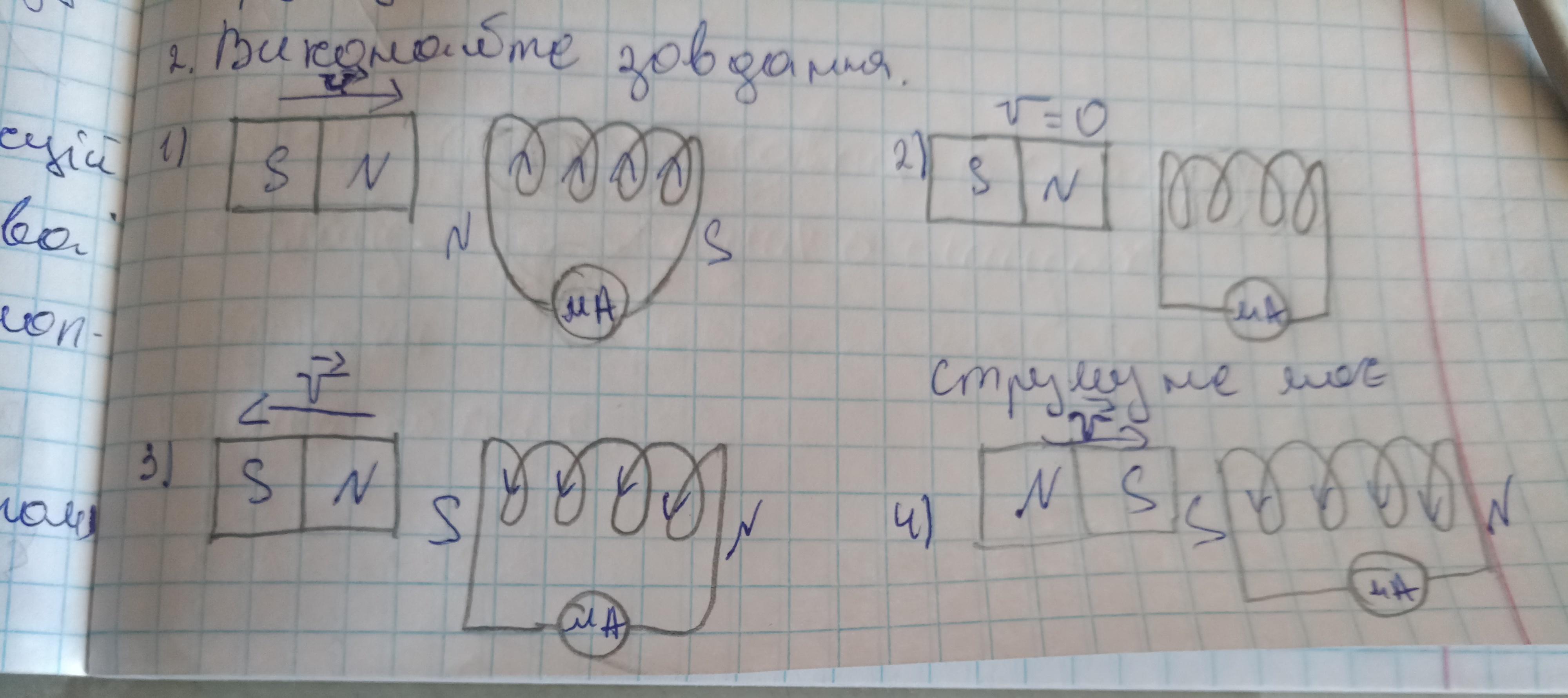 зазначено напрямок швидкості руху магніту. Перенесіть рисунки