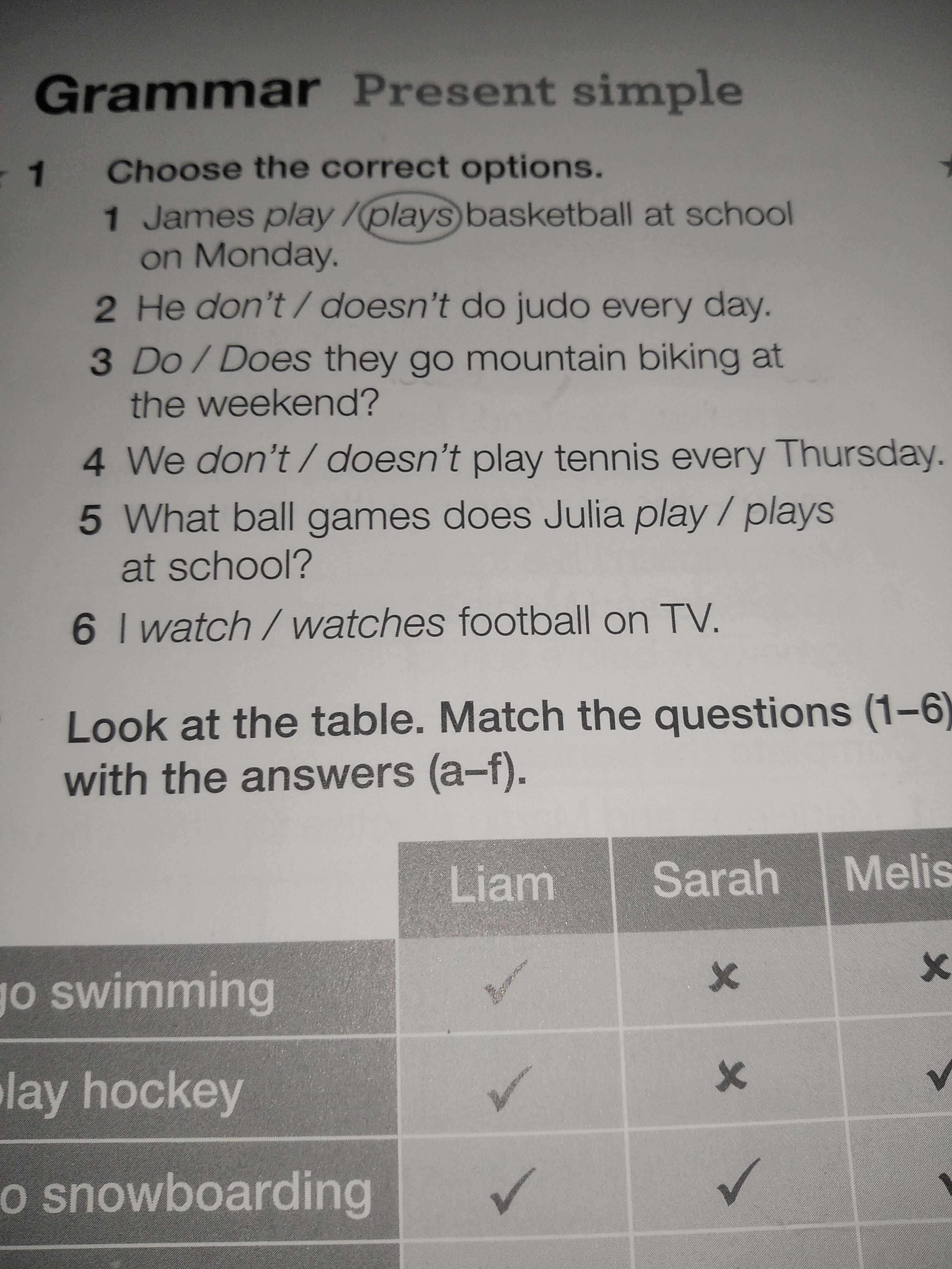 He doesn't do judo every day. Do they go mountain biking at the weekend? We don't play tennis every Thursday. What ball games does julia play at school. I watch football on tv.