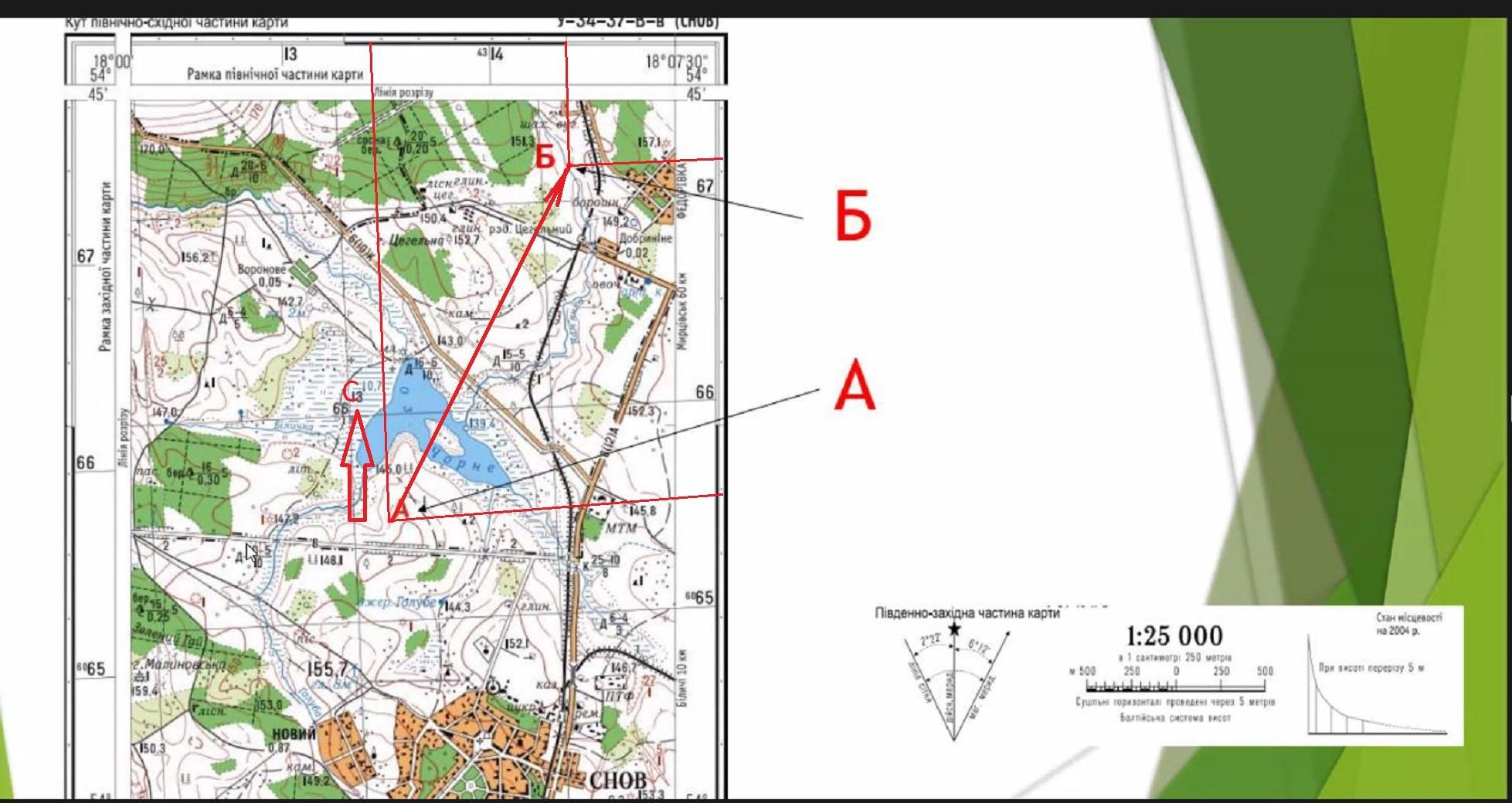 - Відстань між точками А і Б скориставшись лінійним масштабом дорівнює 2250 м