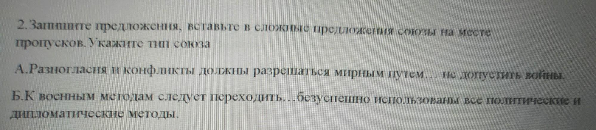 2. Запишите предложення, вставьте в сложные предложения союзы на месте пропусков. Укажите тип союза А.Разногласия и конфликты должны разрешаться мирным путем... не допустить войны. Б.К военным методам следует переходить...безуспешно использованы все политические и дипломатические методы.