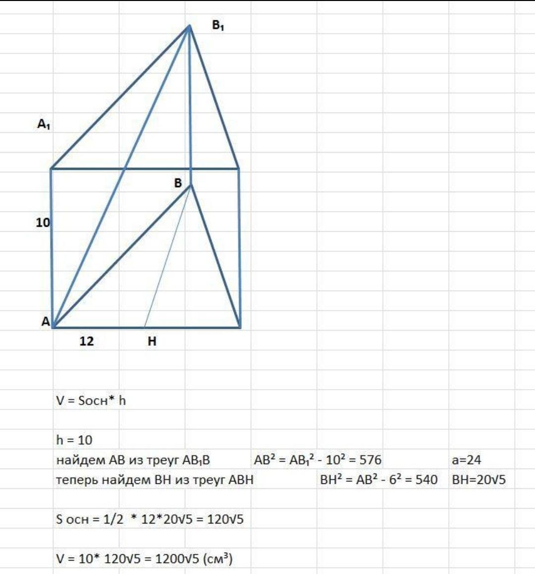 В основі прямої призми лежить рівнобедрений трикутник з основою 10 см і висотою, проведеною до основи, 12 см. Бічне ребро призми дорівнює 20 см. Обчислити площу бічної поверхні призми.