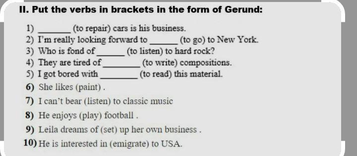 Ответ: repairing, going , listening, writing, reading, painting, listening playing, setting, emigrating