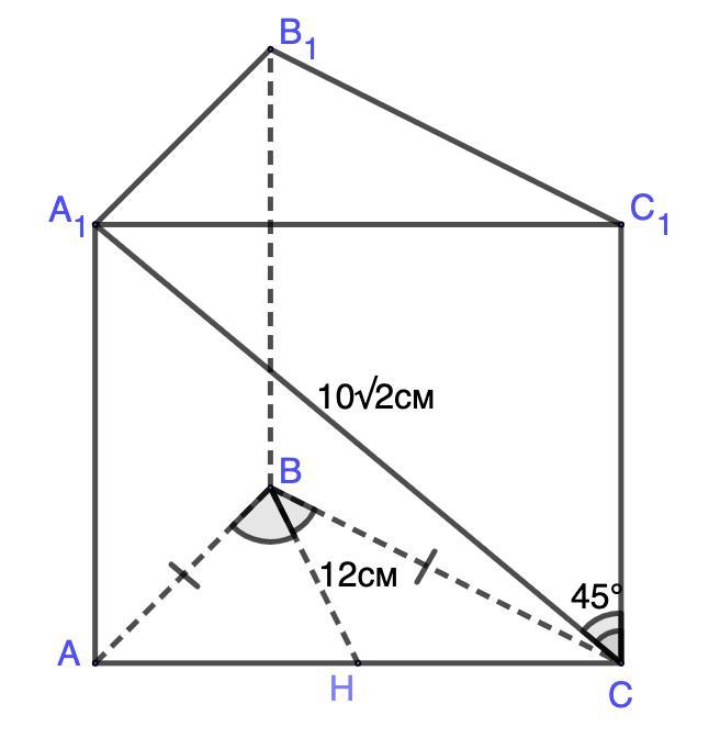 Основа прямой призмы - равнобедренный треугольник, в котором биссектриса угла при вершине равна 12 см. Диагональ боковой грани, которая содержит основание треугольника, равна 10√2 см и образует с боковым ребром призмы угол 45°