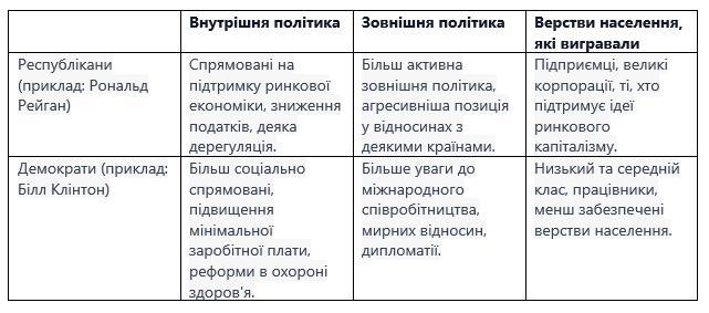Ось таблиця порівняння внутрішньої та зовнішньої політики президентів США від республіканців і демократів, а також верств населення, які найбільше вигравали від їхньої стратегії: