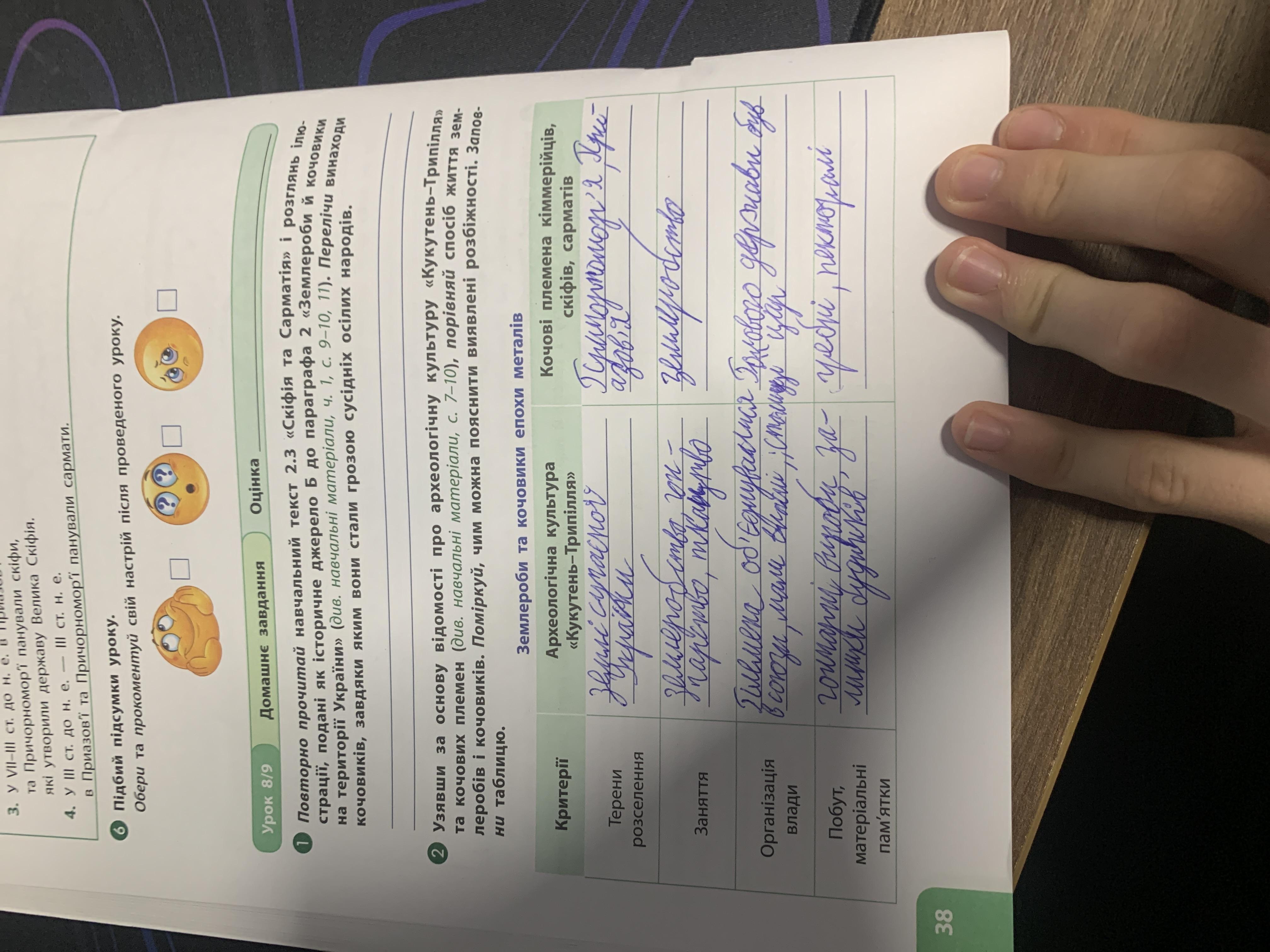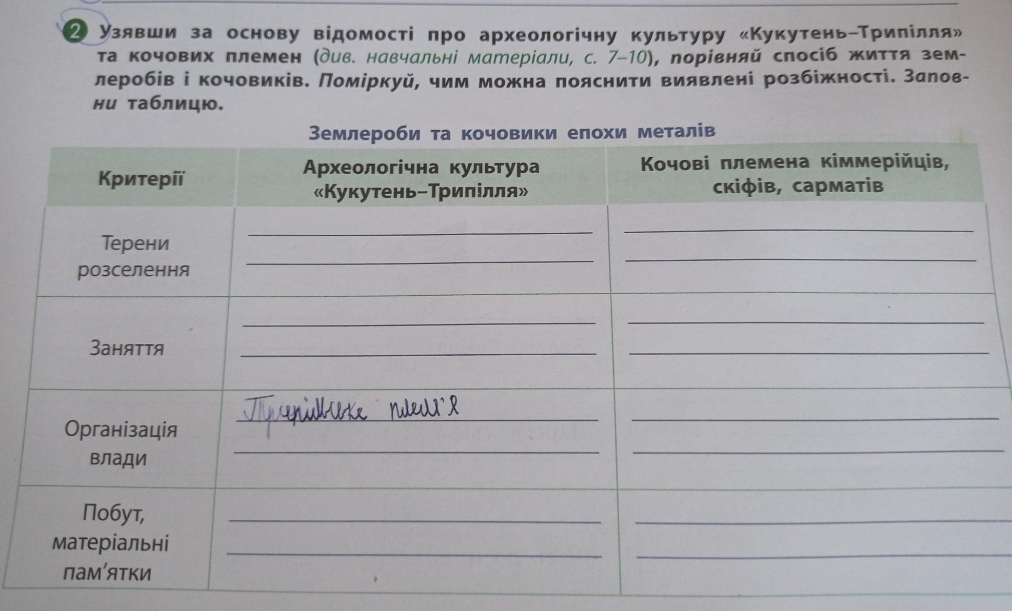 2 Узявши за основу відомості про археологічну культуру «Кукутень-Трипілля>> та кочових племен (див. навчальні матеріали, с. 7-10), порівняй спосіб життя зем- леробів і кочовиків. Поміркуй, чим можна пояснити виявлені розбіжності. Запов- ни таблицю. Критерії Терени розселення Заняття Органiзацiя влади Побут, матеріальні пам'ятки Землероби та кочовики епохи металів Археологічна культура «Кукутень-Трипілля>> Кочові племена кіммерійців, скіфів, сарматів