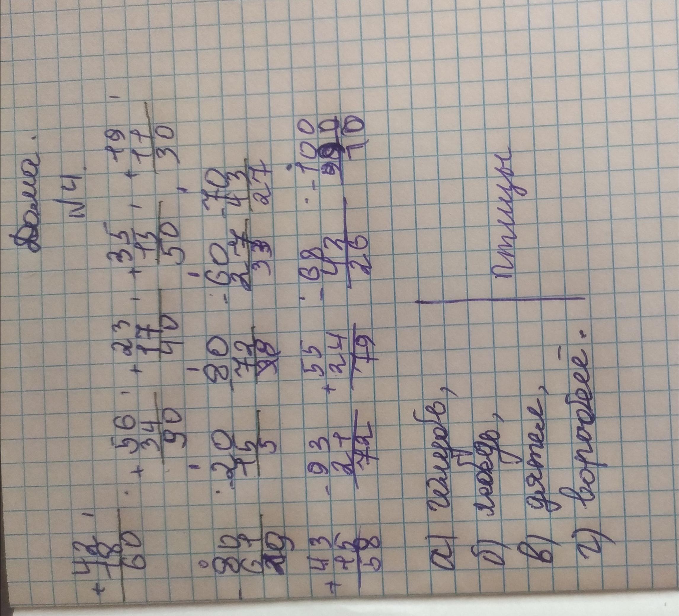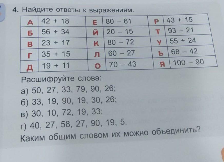 4. Найдите ответы к выражениям. 42 + 18 80 - 61 56 + 34 20 - 15 23 + 17 К 80-72 35 + 15 л 60 - 27 д 19 + 11 0 | 70 - 43 Расшифруйте слова: a) 50, 27, 33, 79, 90, 26; 6) 33, 19, 90, 19, 30, 26; А Б B E й P 43 + 15 T 93 - 21 Y 55 +24 Ь 68-42 Я | 100 - 90 в) 30, 10, 72, 19, 33; r) 40, 27, 58, 27, 90, 19, 5. Каким общим словом их можно объединить?