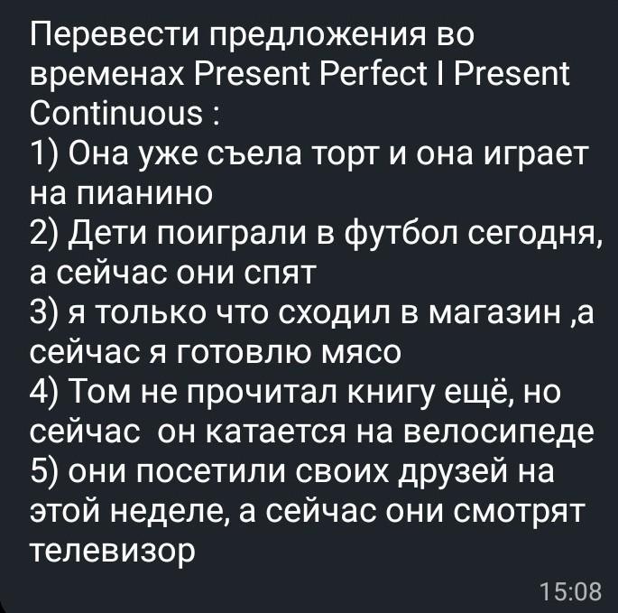 во Перевести предложения временах Present Perfect I Present Continuous : 1) Она уже съела торт и она играет на пианино 2) Дети поиграли в футбол сегодня, а сейчас они спят 3) я только что сходил в магазин ,а сейчас я готовлю мясо 4) Том не прочитал книгу ещё, но сейчас он катается на велосипеде 5) они посетили своих друзей на этой неделе, а сейчас они смотрят телевизор.