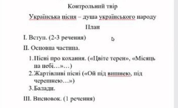 Українська пісня завжди була неодмінною частиною душі народу, відображаючи його почуття, традиції та історію через різноманітні мелодії та тексти. У цьому контрольному творі розглянемо різні аспекти української пісні через приклади різних її жанрів.