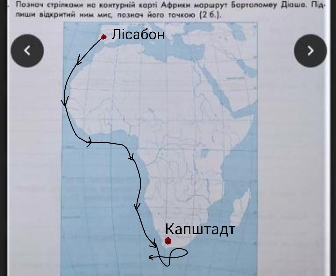 Познач стрілками на контурній карті Африки маршрут Бартоломеу Діаш пиши відкритий ним мис, познач його точкою
