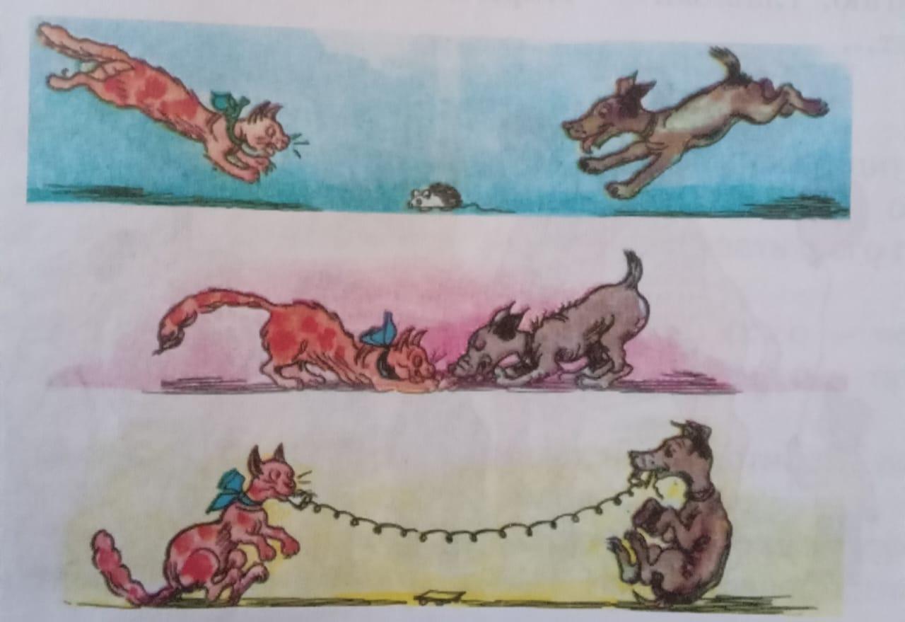 Ишли на встречу собака и кошка,вдруг оба видят как на середину дороги вибежала мыша.Мыша или к собаки или к коту била близка.И как начали битьм=ся кот с собакой.Бились,бились пока мыша не разорвалась.Все бы нечего кот и собака разошлись бы по домам,но та мыша оказалась игрушечной.Наши герои растроились и пошли вместе искать мышь снова (живых),только уже как друзья.
