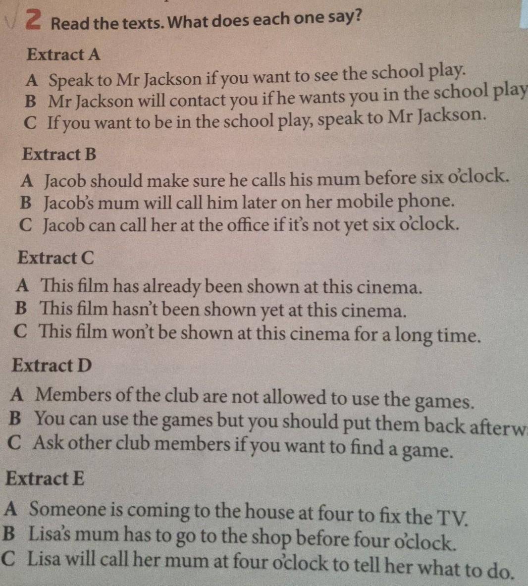 2 Read the texts. What does each one say? Extract A A Speak to Mr Jackson if you want to see the school play. B Mr Jackson will contact you if he wants you in the school play. C If you want to be in the school play, speak to Mr Jackson. Extract B 20 A Jacob should make sure he calls his mum before six o'clock. B Jacob's mum will call him later on her mobile phone. C Jacob can call her at the office if it's not yet six o'clock. Extract C A This film has already been shown at this cinema. B This film hasn't been shown yet at this cinema. C This film won't be shown at this cinema for a long time. tonig F Extract D A Members of the club are not allowed to use the games. B You can use the games but you should put them back afterwards. C Ask other club members if you want to find a game. Extract E A Someone is coming to the house at four to fix the TV. B Lisa's mum has to go to the shop before four o'clock. C Lisa will call her mum at four o'clock to tell her what to do.