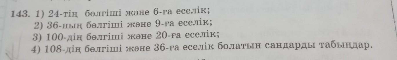 . 1) 24-тің бөлгіші және 6-ға еселік; 2) 36-ның бөлгіші және 9-ға еселік; 3) 100-дің бөлгіші және 20-ға еселік; 4) 108-дің бөлгіші және 36-ға еселік болатын сандарды табыңдар.
