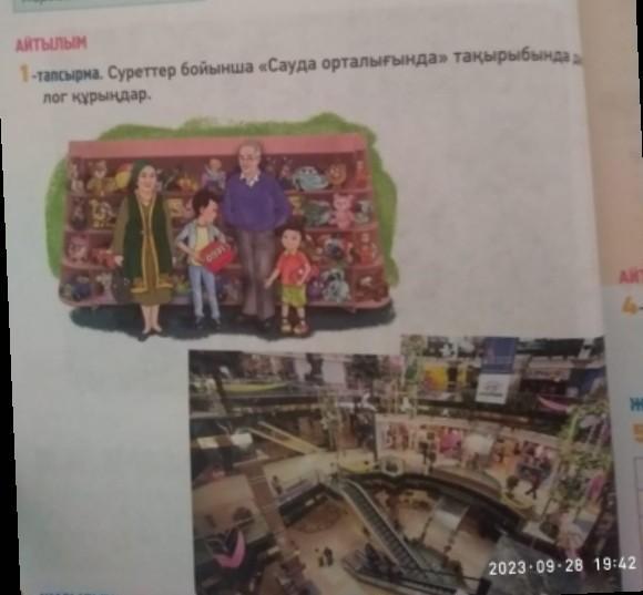 АЙТЫЛЫМ 1-тапсырма. Суреттер бойынша «Сауда орталығында>> такырыбында лог курындар. ЖАЗЫЛЫМ