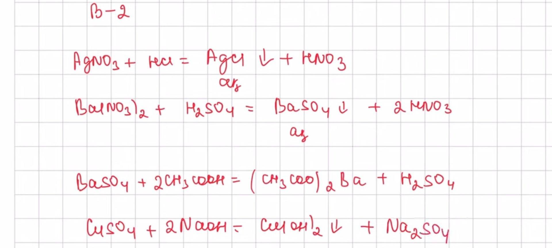В 1. Fe2+, Fe3+, Cu2+ иондарына кандай сапалык реакция тән? Реакция теңдеулерін иондық түрде жазыңдар. 2. Мәтiндi толыктырып, сәйкес реакция теңдеулерін жазындар: Күміс нитратына ... қосқанда ак ірімшік тәрiздi тұнба тузiледi. Барий нитратына ... косса ак тұнба түзіледі, ол тұнба...қышқыл қосса....Мыс сульфатына натрий ги- дроксидін косса...тұнба түзіледі.
