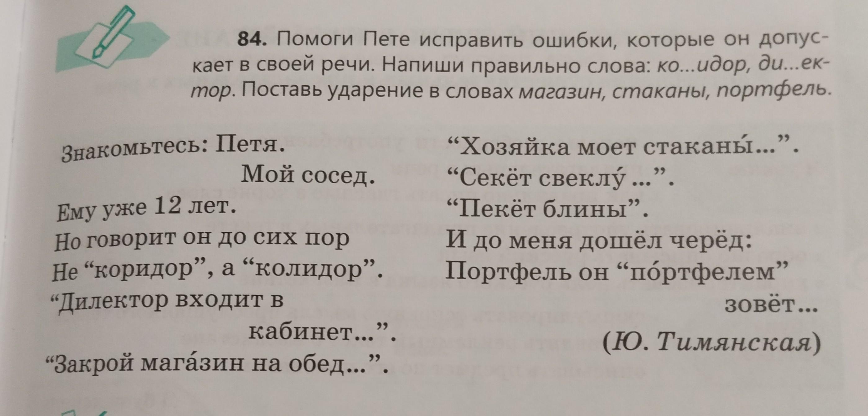 84. Помоги Пете исправить ошибки, которые он допус- кает в своей речи. Напиши правильно слова: ко...идор, ди...ек- мор. Поставь ударение в словах магазин, стаканы, портфель. Знакомьтесь: Петя. Мой сосед. Ему уже 12 лет. Но говорит он до сих пор Не "коридор", а "колидор". "Дилектор входит в кабинет...". "Закрой магазин на обед...". "Хозяйка моет стаканы...". "Секëт свеклу ...". "Пекëт блины". И до меня дошёл черëд: Портфель он "портфелем" зовëт... (Ю. Тимянская)
