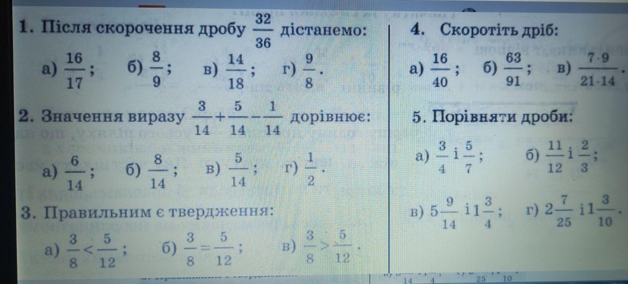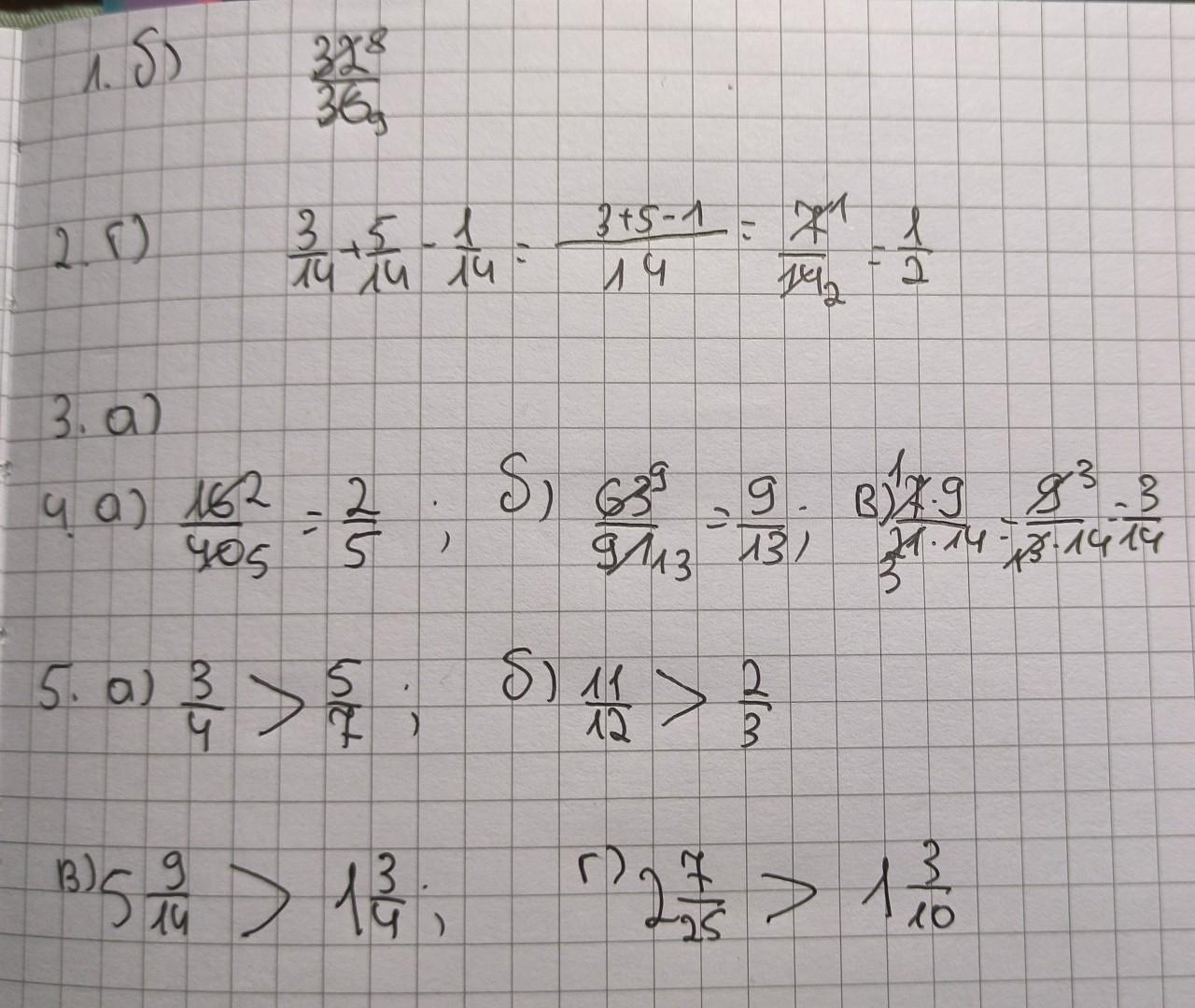 5 3/4>5/7. б)11/12>2/3. в) 5×9/14>1×3/4. г) 2×7/25>1×3/10