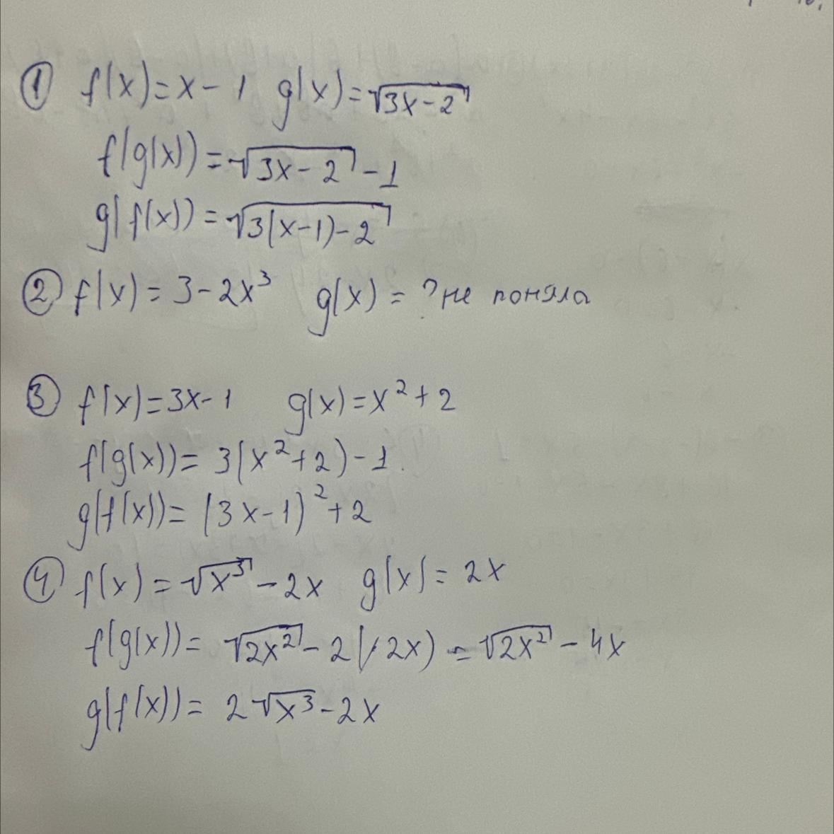 10.7. Составьте сложные функции f(g(x)), f(f(x)), g(g(x)), если: 1) f(x) = x-1, g(x)=√√3x-2; 2) f(x) = 3-2x³, g(x) =-=-=-2: 1 4)f(x) = √x³ - 2x, g(x) =/; 2x 3) f(x) 3x-1' = g(x) = x² + 2