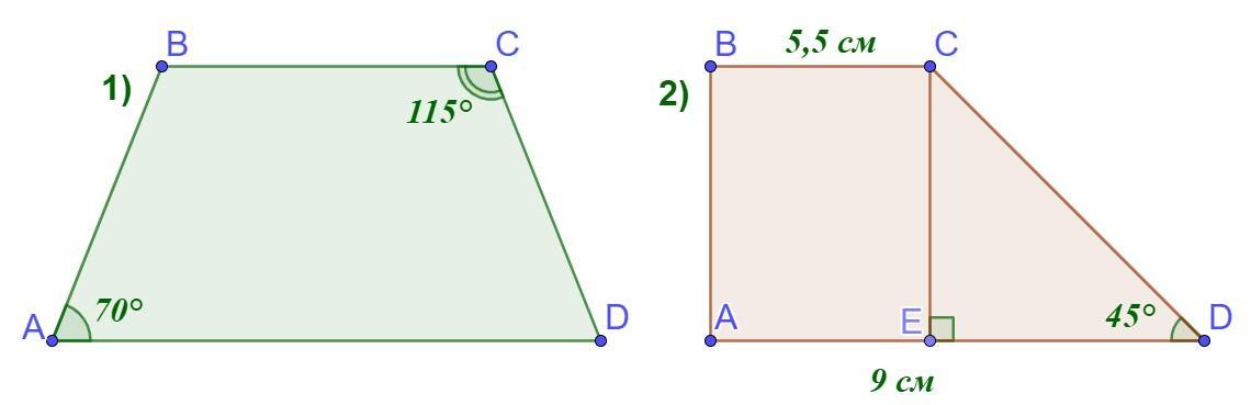 1)Два кути трапеції дорівнюють 115° і 70°. Знайди інші її кути.