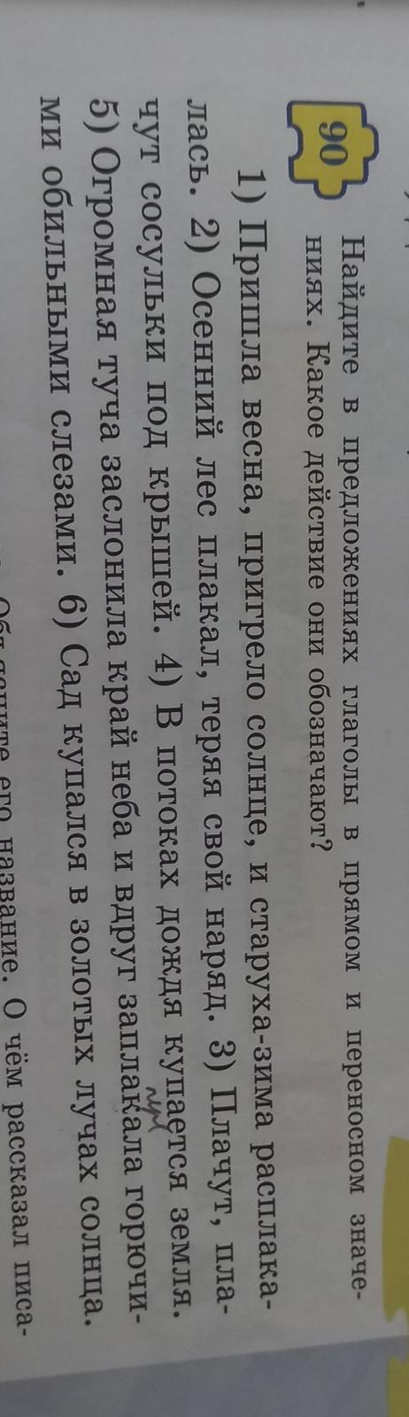 90 Найдите в предложениях глаголы в прямом и переносном значе- ниях. Какое действие они обозначают? 1) Пришла весна, пригрело солнце, и старуха-зима расплака- лась. 2) Осенний лес плакал, теряя свой наряд. 3) Плачут, пла- чут сосульки под крышей. 4) в потоках дождя купается земля. пере 5) Огромная туча заслонила край неба и вдруг заплакала горючи- ми обильными слезами. 6) Сад купался в золотых лучах солнца. Дам 40 б