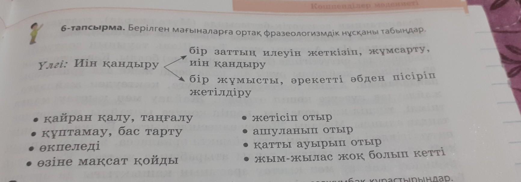 6-тапсырма. Берілген мағыналарға ортақ фразеологизмдік нұсқаны табыңдар. бір заттың илеуін жеткізіп, жұмсарту, иін қандыру бiр жұмысты, әрекетті әбден пісіріп жетілдіру • кайран қалу, таңғалу • құптамау, бас тарту Кошпенділер моде • өкпеледі • өзіне мақсат қойды жетісіп отыр ашуланып отыр • қатты ауысып отыр • жым-жылас жок болып кетті