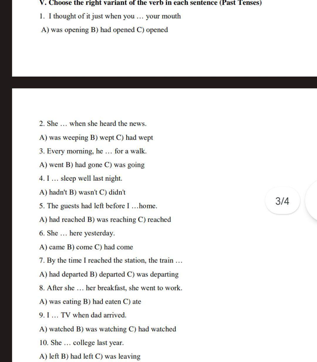 9. I **was watching** TV when dad arrived. (B)