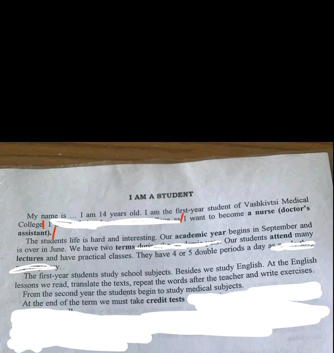 Май нейм із (твоє імʼя). Ай ем фотин йеарс олд. Ай ем зе фьорст йеар стйудент оф Вашківтсьі Медікал Коледж.