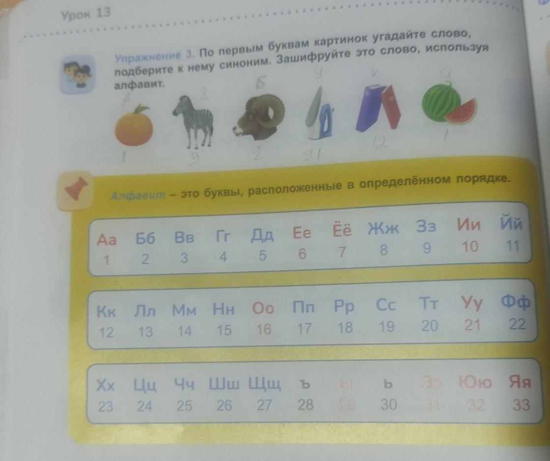Урок 13 Упражнение 3. По первым буквам картинок угадайте слово, подберите к нему синоним. Зашифруйте это слово, используя алфавит.