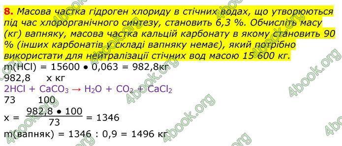 Масова частка гідроген хлориду в стічних водах, що утворюються під час хлорорганічного синтезу, становить 6,3 %. Обчисліть масу (кг) вапняку, масова частка кальцій карбонату в якому становить 90 % (інших карбонатів у складі вапняку немає), який потрібно використати для нейтралізації стічних вод масою 15 600 кг.