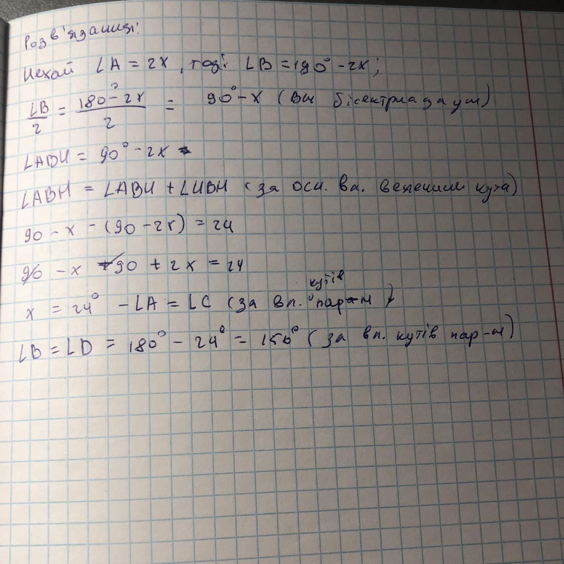 5.12.° Кут мiж висотою ВН паралелограма АBCD і бісектрисою ВМ кута АВС дорівнює 24°. Знайдіть кути паралелограма.